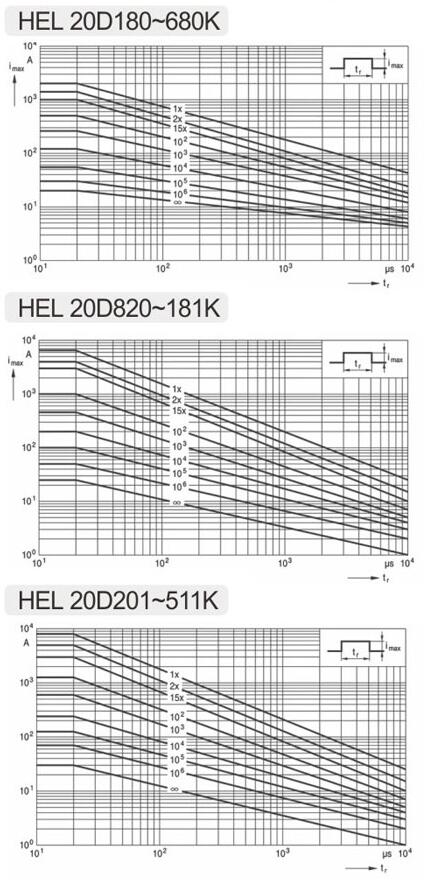 14D滿足20D的 脈沖性能要求 14D instead of 20D 舉例2 Example HEL14D561KX能達到 6KV/3KA 100次 HEL14D561KX reach 6KV/3KA 100 times? |